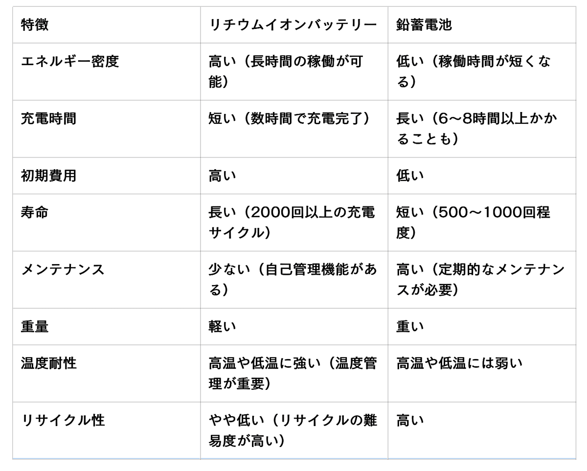 リチウムイオンバッテリーは、同じサイズで鉛蓄電池よりも多くのエネルギーを蓄えることができ、長時間の稼働が可能です。これにより、より効率的な運用が実現します。